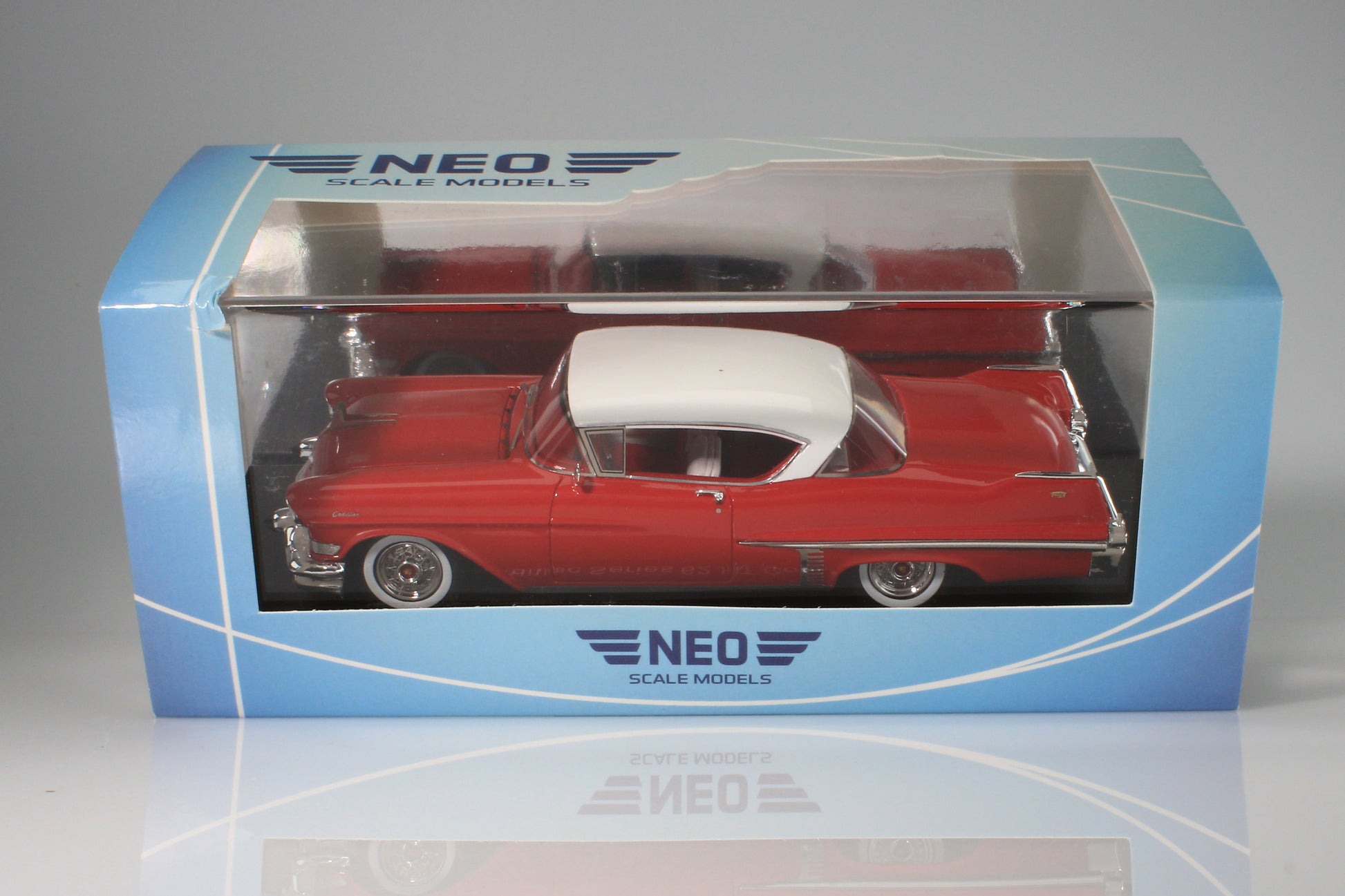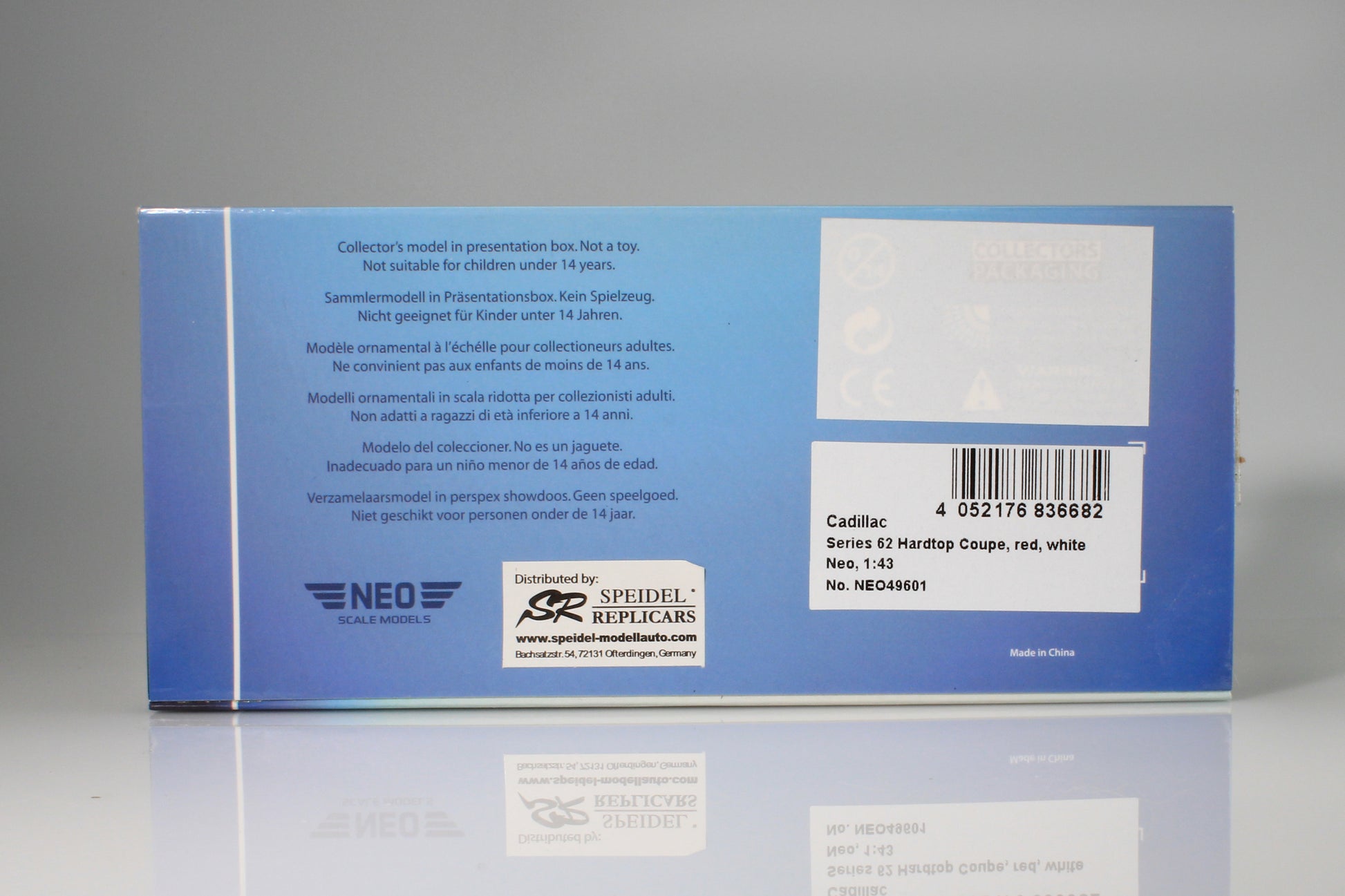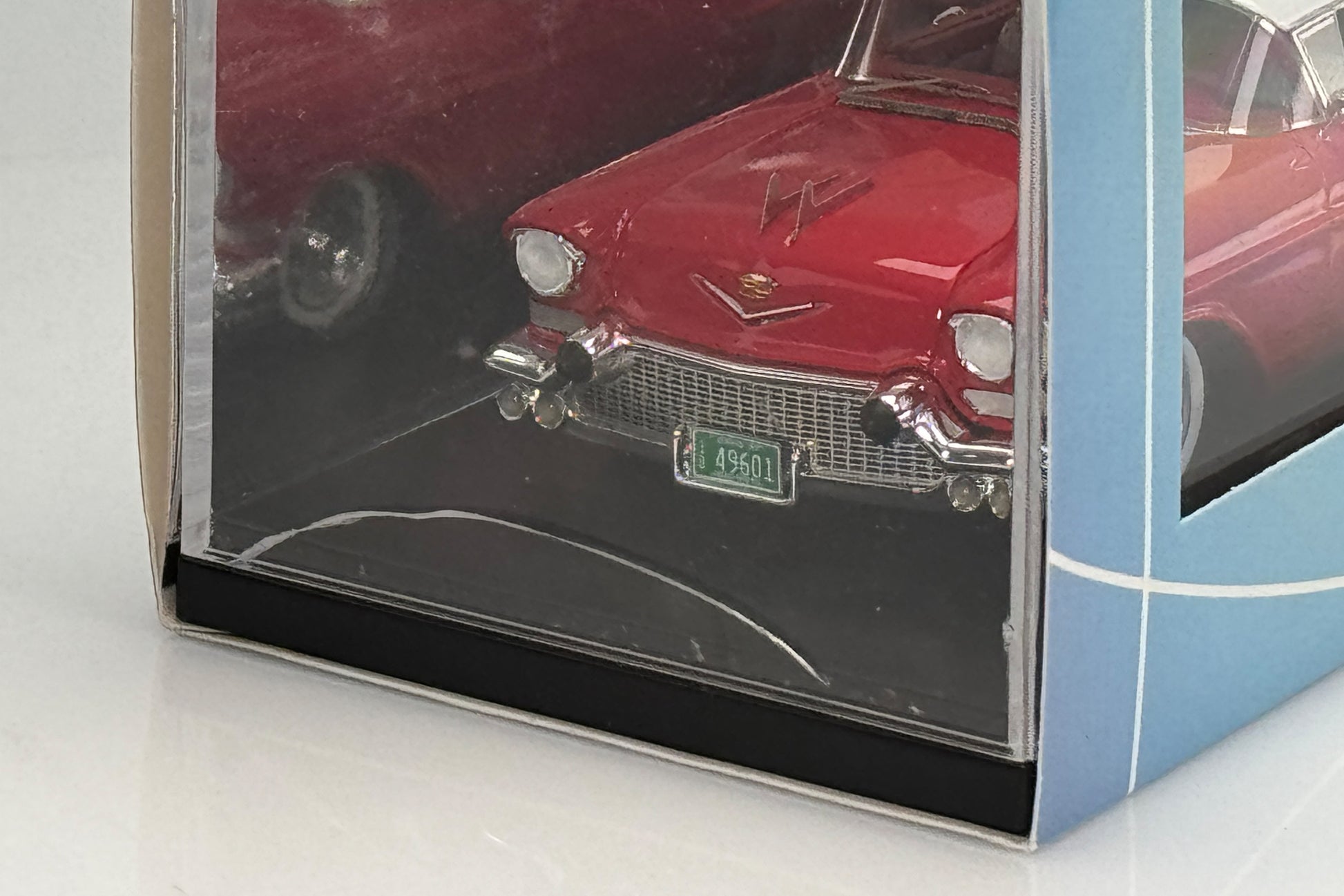 The clear display cover has a crack in one end, and the cardboard sleeve has some wrinkling on the left front corner. See photos.