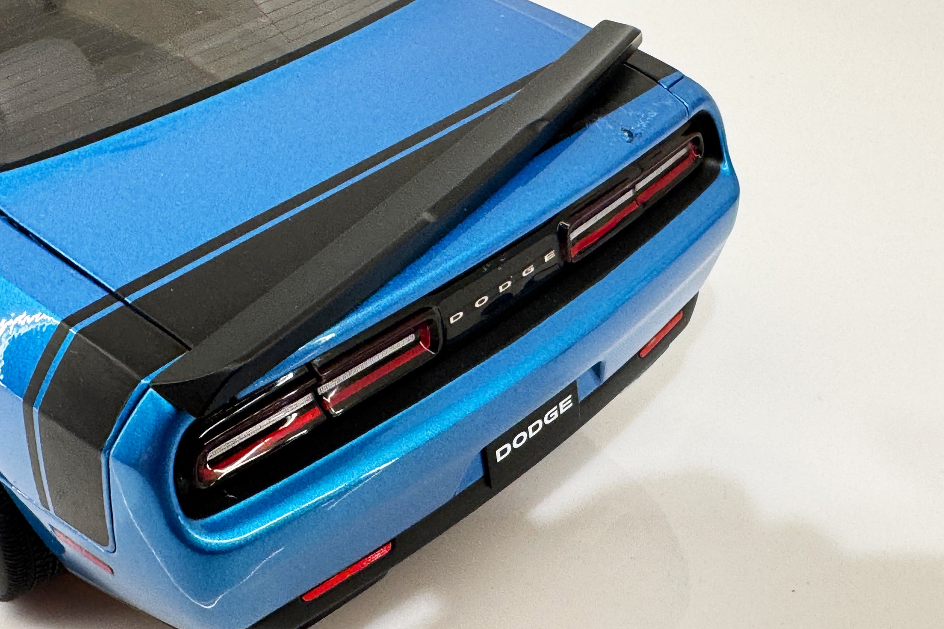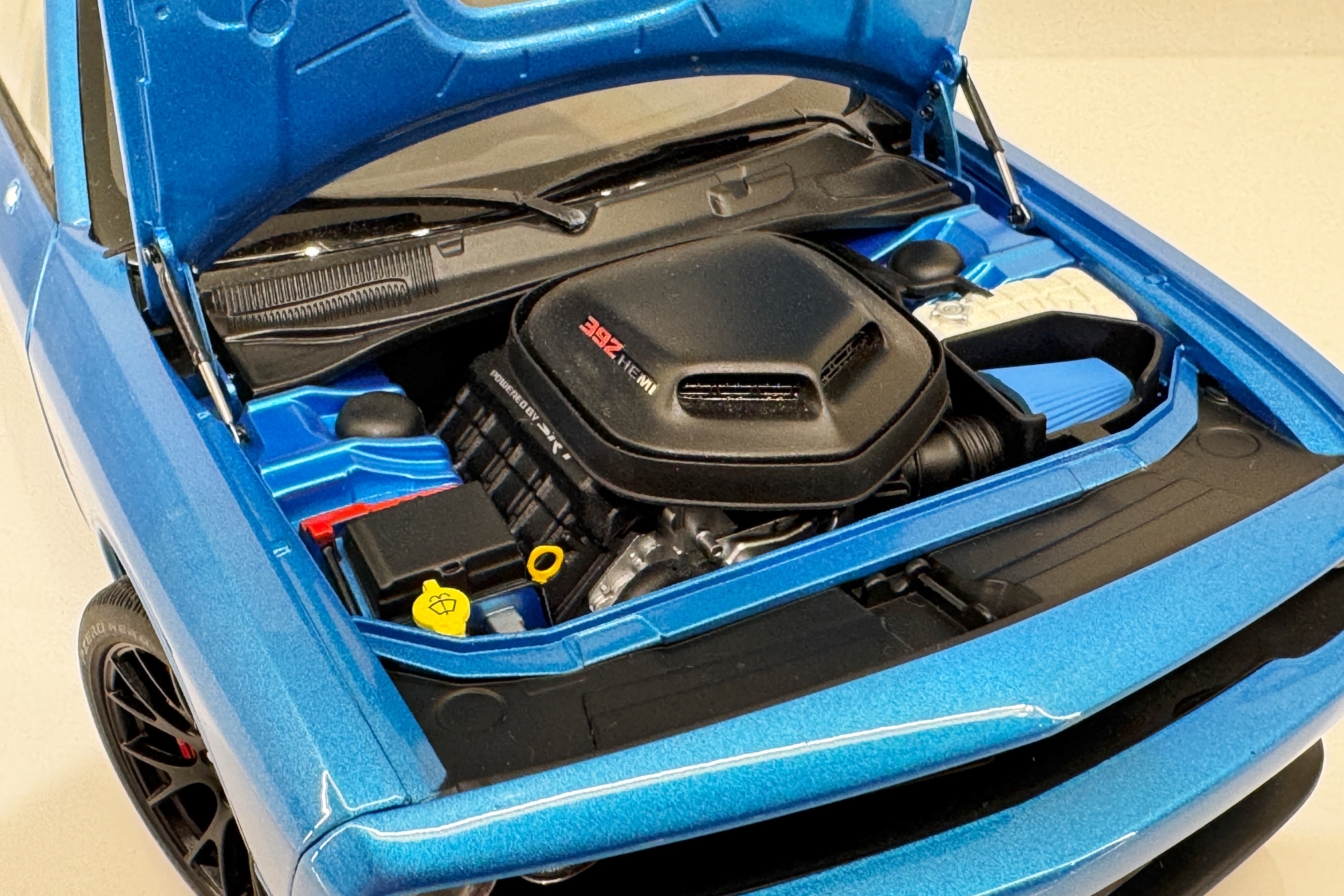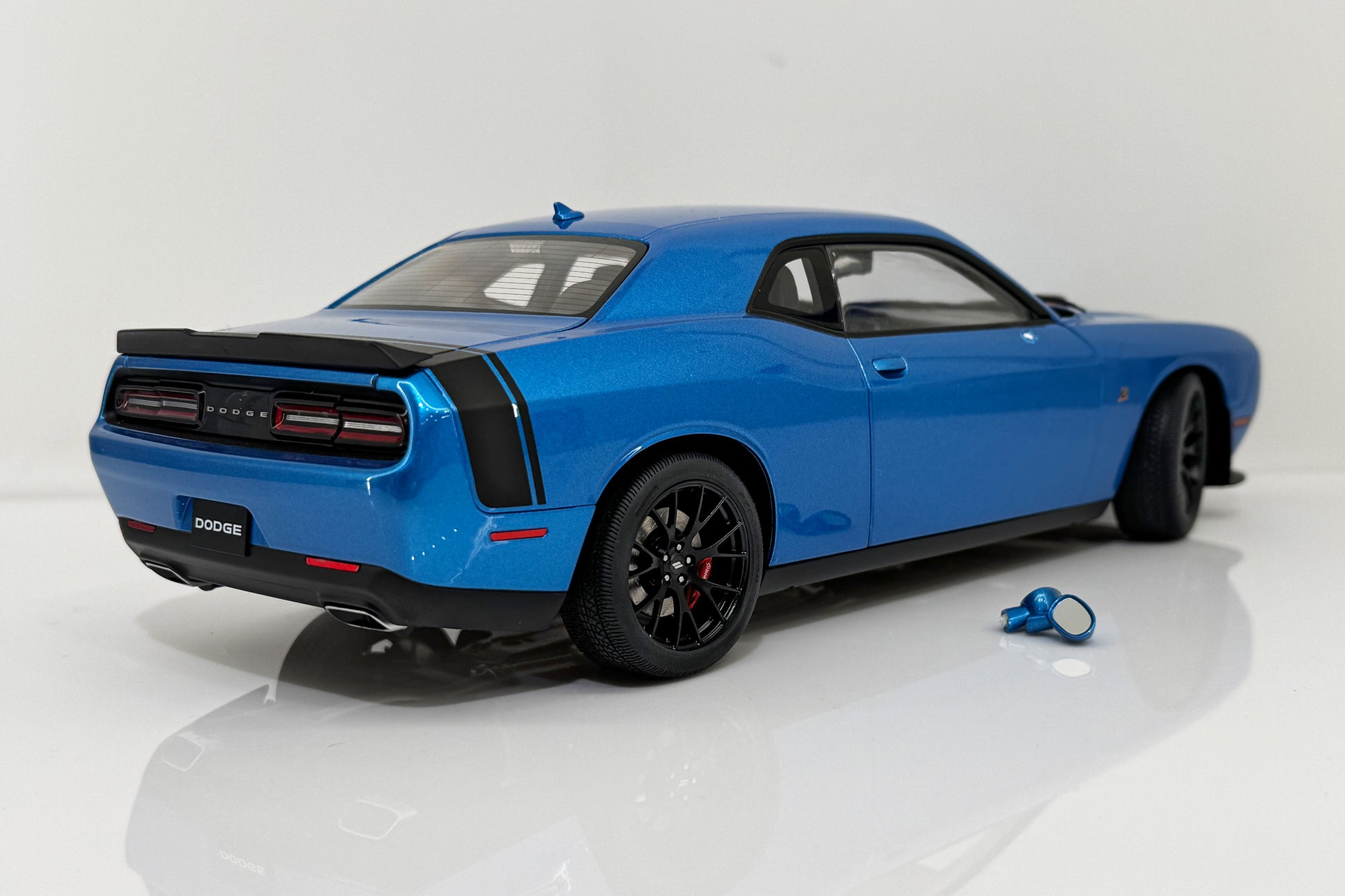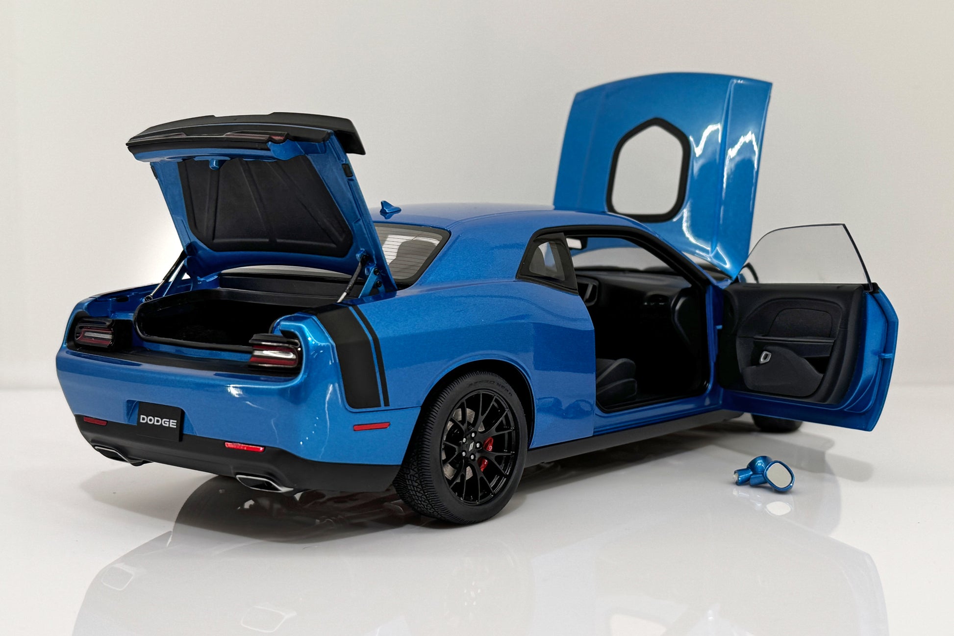 Both mirrors are detached. Rear spoiler is detached on one side. It come with a box and styrofoam (for a different AUTOart Challenger model) but does not have the screws that hold it onto the styrofoam.