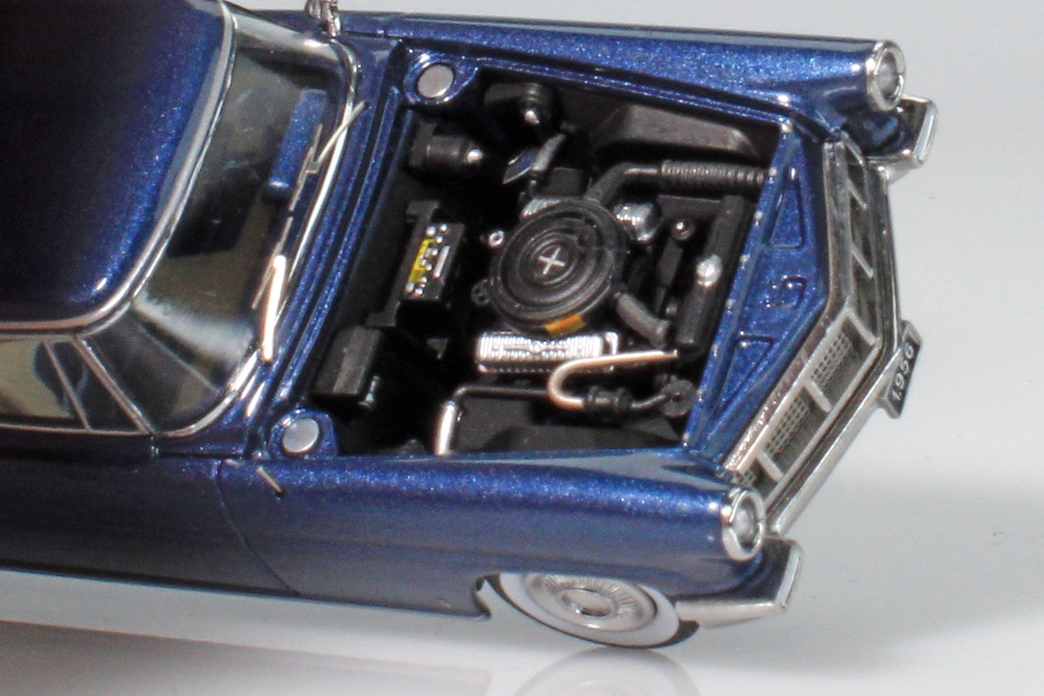 If you only ever buy one 1:64 scale model in your life, this should be the one! This jewel-like model features an opening trunk (with flocking!), a magnetically-attached hood which can be removed to reveal the well-detailed engine, complete with decals on the battery and air cleaner!
